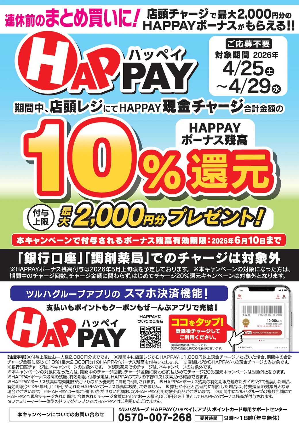 ・期間中にツルハグループの複数店舗にてHAPPAYへ現金チャージされた場合、合算されたチャージ金額に応じてお一人様2,000円分を上限としてHAPPAYボーナス残高が付与されます。