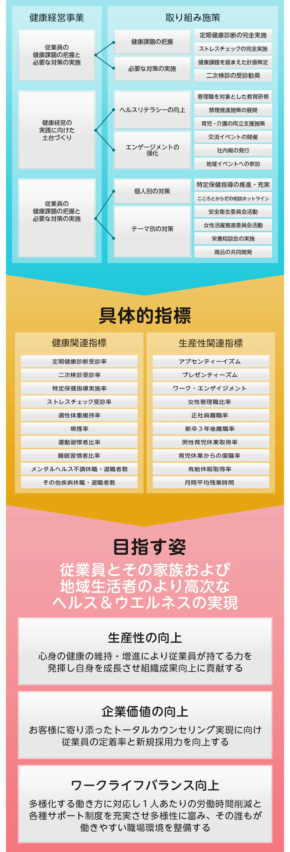 従業員とその家族の心身の健康と安全を守り、多様化する働き方のニーズに応じたワークライフバランスと1人当たりの労働時間短縮により働きやすい職場環境づくりを推進し、地域社会への永続的な貢献を果たすとともに従業員とその家族の健康管理に積極的に取り組むことを宣言いたします。