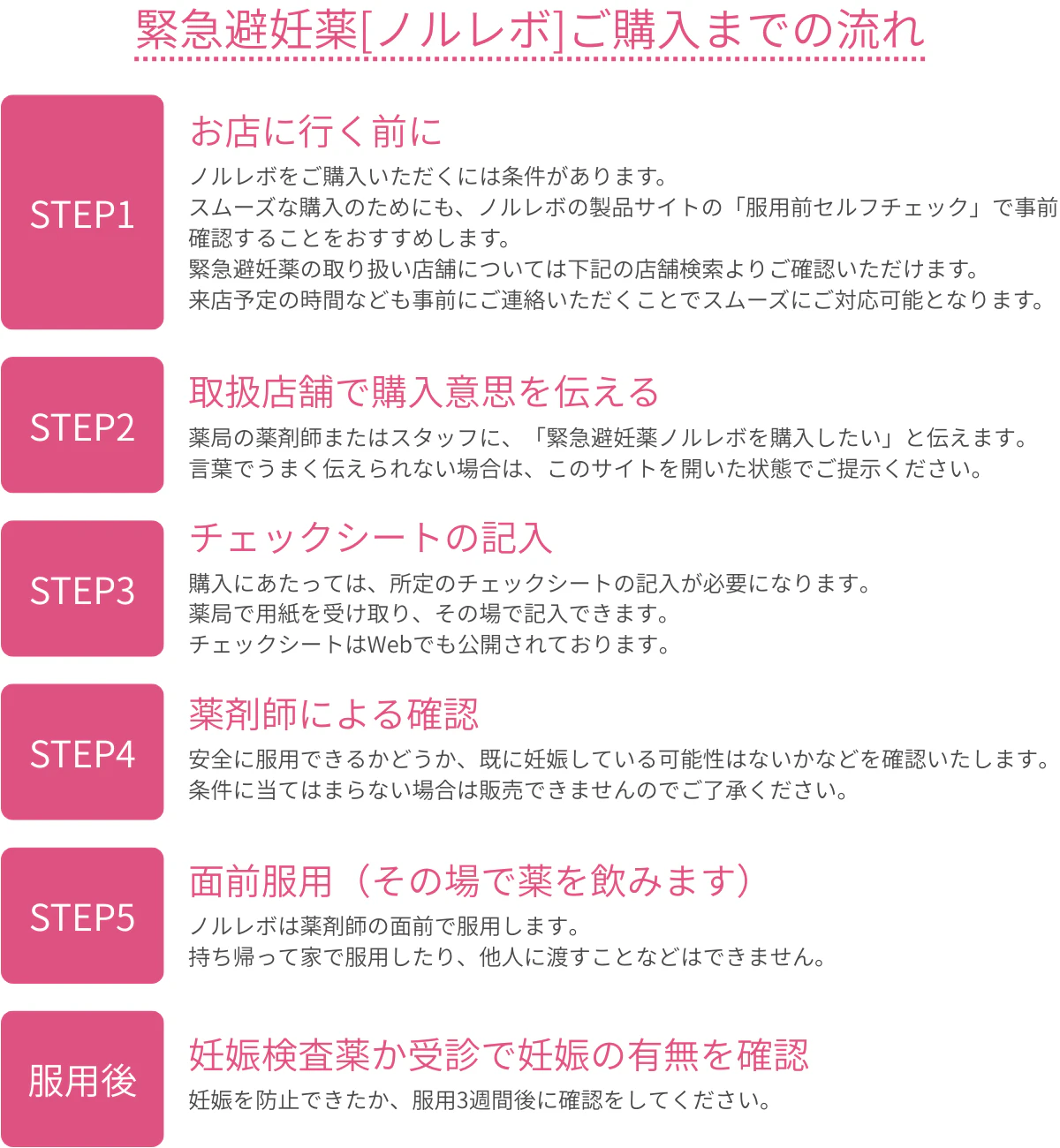 日本で認可されている緊急避妊薬は、要指導医薬品の「ノルレボ」(ご利用方法①)、処方せん医薬品の処方せん医薬品の「ノルレボ錠1.5mg」「レボノルゲストレル錠1.5mg(ノルレボ錠1.5mgのジェネリック医薬品)」(ご利用方法②)がございます。性行為から72時間以内に1錠服用します。早く服用した方が、効果が高いことがわかっています。